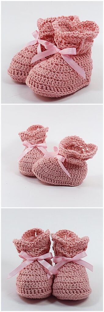 The construction starts with the sole, crocheted flat or in the round using single or half double crochet stitches. From there, the top part of the bootie is built upward directly from the sole, with a few increases or decreases to shape the toe and ankle area. Many tutorials include a ribbed cuff, worked in the back loop only, which not only helps keep the booties on snugly but also adds a cute finish.