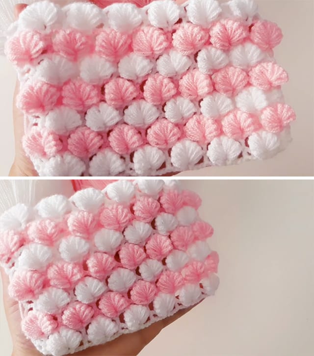 Creating this is incredibly enjoyable, thanks to its stunning 3D texture and the wonderfully soft feel it achieves! The seashell shapes are not only elegant but also uniquely eye-catching. To craft this puff shell stitch, be sure to use a size 3 hook.