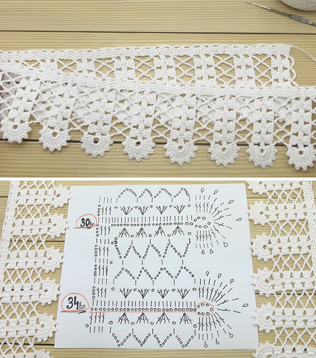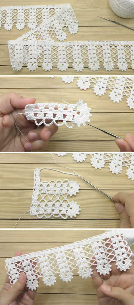 This design features repeating motifs that can be crocheted to your preferred length. The lace is fully reversible, with the back mirroring the front. To craft this elegant crochet tape lace ribbon, you’ll need approximately 50 grams of fine cotton yarn and a 0.75 mm crochet hook.