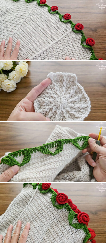 The roses are made by crocheting a long strip of half-double crochet stitches, then rolling the strip into a spiral to form the bloom. Sew the base of each rose securely to hold its shape. These roses are then sewn or crocheted onto the vine at regular intervals — ideally at each corner and evenly along the sides. - Step 3: Attach the Edging