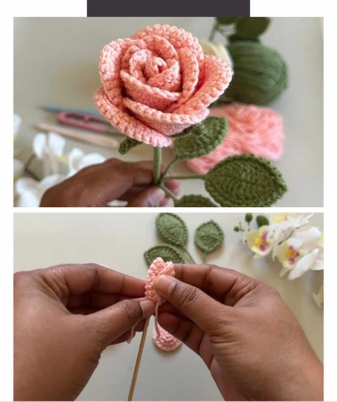 Next, the video demonstrates how to start the rose by crocheting a long foundation chain, which forms the base of the petals. The instructor carefully walks viewers through each stitch with clear, close-up shots, ensuring beginners can easily follow along. After completing the chain, she shows how to build the petals in rows using a combination of double and single crochets. As the petals form, the instructor gives helpful tips on keeping even tension and counting stitches to avoid mistakes. The pace is slow and beginner-friendly, making it easy to pause and practice each step.