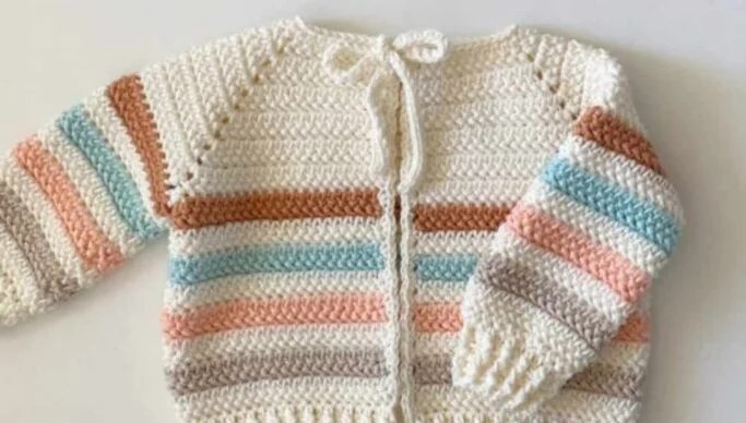 Finishing the sweater with a simple border around the neckline, sleeves, and hem gives it a clean, polished look. The light cotton fabric ensures the baby stays cool yet covered during breezy days or chilly evenings. This striped sweater pairs perfectly with little pants or bloomers and makes a thoughtful, handmade gift for baby showers or birthdays. Whether you’re making it in soft pink and white, nautical navy and cream, or vibrant rainbow tones—this cotton striped baby sweater is a heart-melting, photo-ready piece for any baby’s wardrobe.