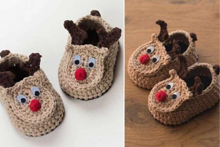 The booties begin with a simple sole, crocheted in oval rounds using basic stitches like single crochet (SC) or half double crochet (HDC). The body of the bootie is built on top of the sole, often worked in continuous or joined rounds to form a snug fit around the baby’s foot. The reindeer face is typically added to the front/top of the bootie, with a red crocheted circle or bobble for the nose, embroidered or safety eyes, and separate ear and antler pieces sewn securely in place. The antlers can be as simple or intricate as desired—some use small chains and slip stitches, while others get creative with branched, 3D designs for a more lifelike look. The upper cuff of the bootie may feature ribbing, buttons, or even faux fur trim for extra winter flair.