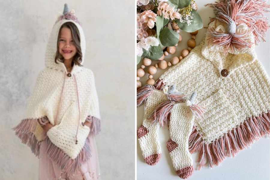 What makes this set extra special is the way it balances practicality with fantasy. The poncho provides warmth and easy wear, while the unicorn details add a magical flair that children love. It’s often made in pastel shades or rainbow tones, but can be customized in any color scheme. The set may also include matching accessories like socks or booties, completing the enchanting look.
