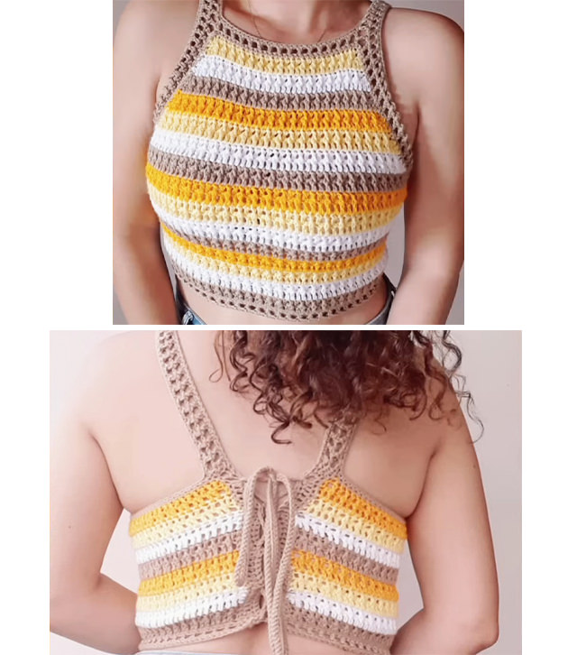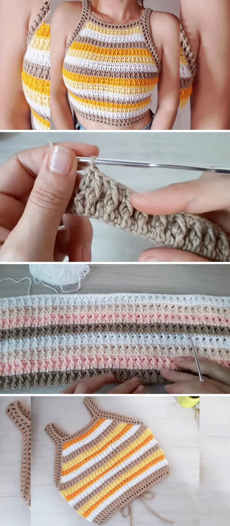 The yarn you choose does more than add texture—it defines the entire vibe of your halter top. For a lightweight, comfortable fit, go with 100% cotton yarn or a soft cotton blend. Cotton is breathable, durable, and easy to care for—ideal for warm-weather wear. The design featured in the video tutorial showcases a charming mix of earthy beige, sunny yellow, burnt orange, and crisp white stripes. This warm, beach-inspired palette evokes the glow of golden hour. The best part about crafting your own crochet halter top is the freedom to customize. Feel free to experiment with pastels, monochrome shades, or bold jewel tones to match your style and wardrobe. A medium weight (Category 3 or 4) yarn is perfect for balancing coverage and breathability. You’ll also want a 3.5 mm crochet hook or slightly larger, depending on your tension and the yarn’s recommendations. Don’t forget essentials like scissors, a yarn needle for weaving in ends, and stitch markers to assist with shaping and strap placement. Optional but handy tools include a measuring tape and a blocking mat to give your top a polished, professional finish. With these simple materials and tools, you’ll create a beautiful, functional piece you’ll love wearing all summer long.