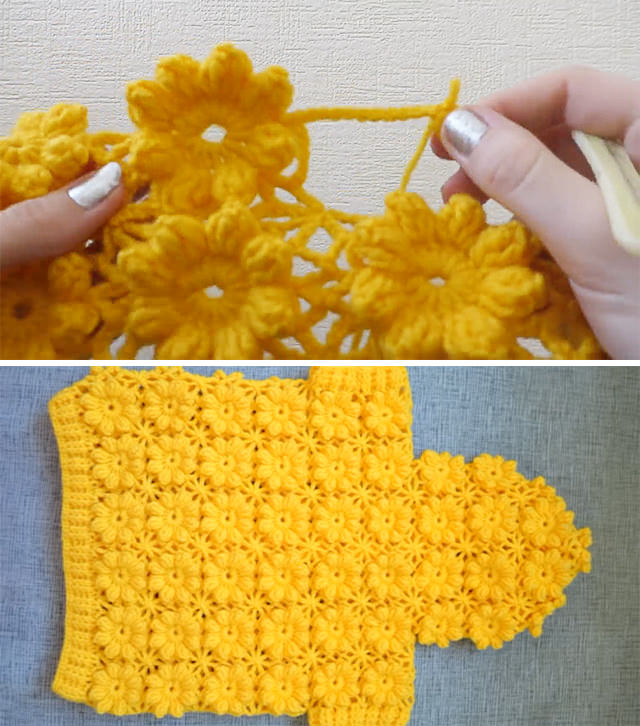 - Once a flower is complete, connect it with others using crochet chains.