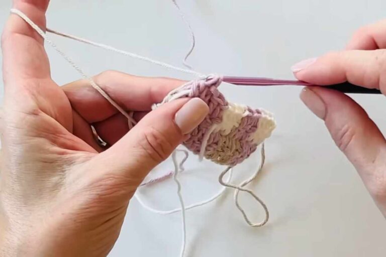 - Work in hdc rows, alternating color blocks every 4–6 stitches and rows