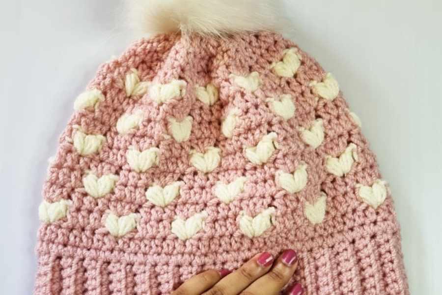 - Repeat the pattern evenly around the beanie, spacing hearts as desired.