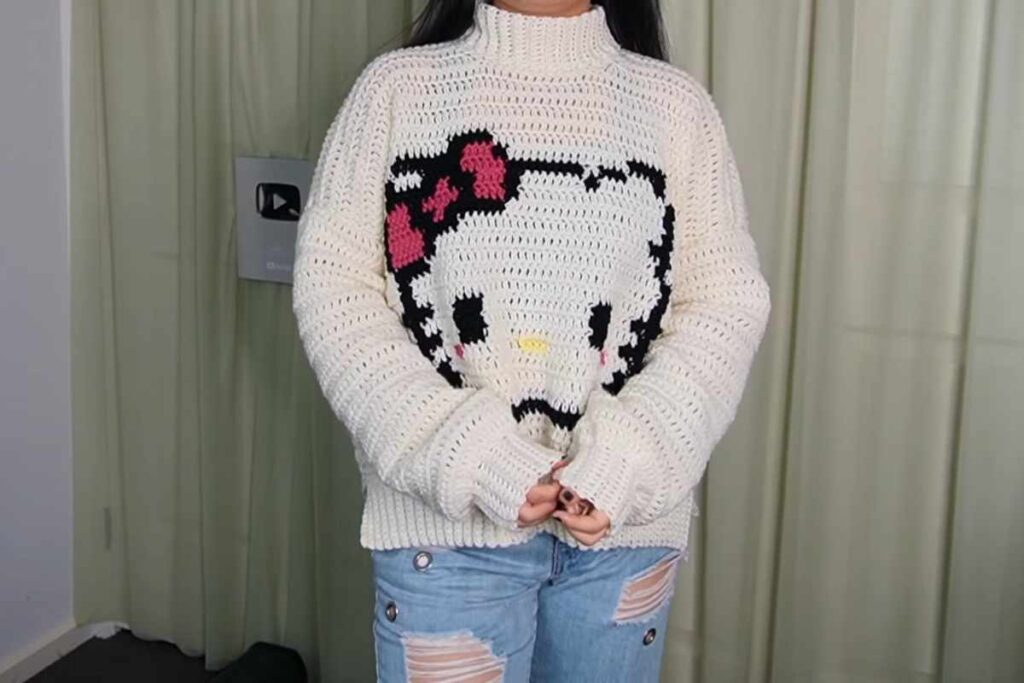 Once the sweater is complete, it’s time to bring Hello Kitty to life! You can either:- Crochet a Hello Kitty appliqué and sew it onto the sweater,